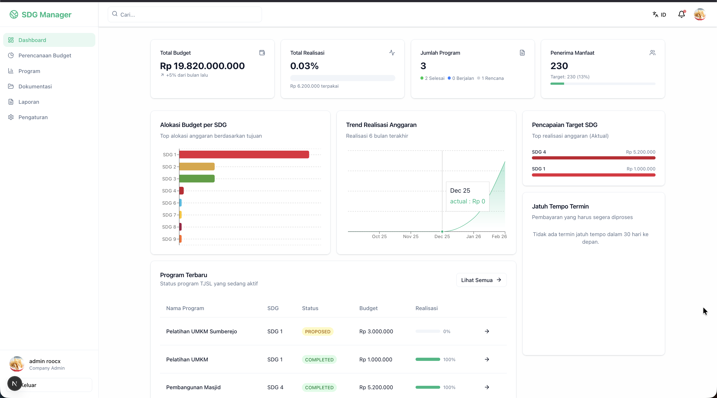 Otomasi pelaporan TJSL, tracking realisasi anggaran, hingga generate laporan corporate-grade yang sesuai dengan standar SDGs.